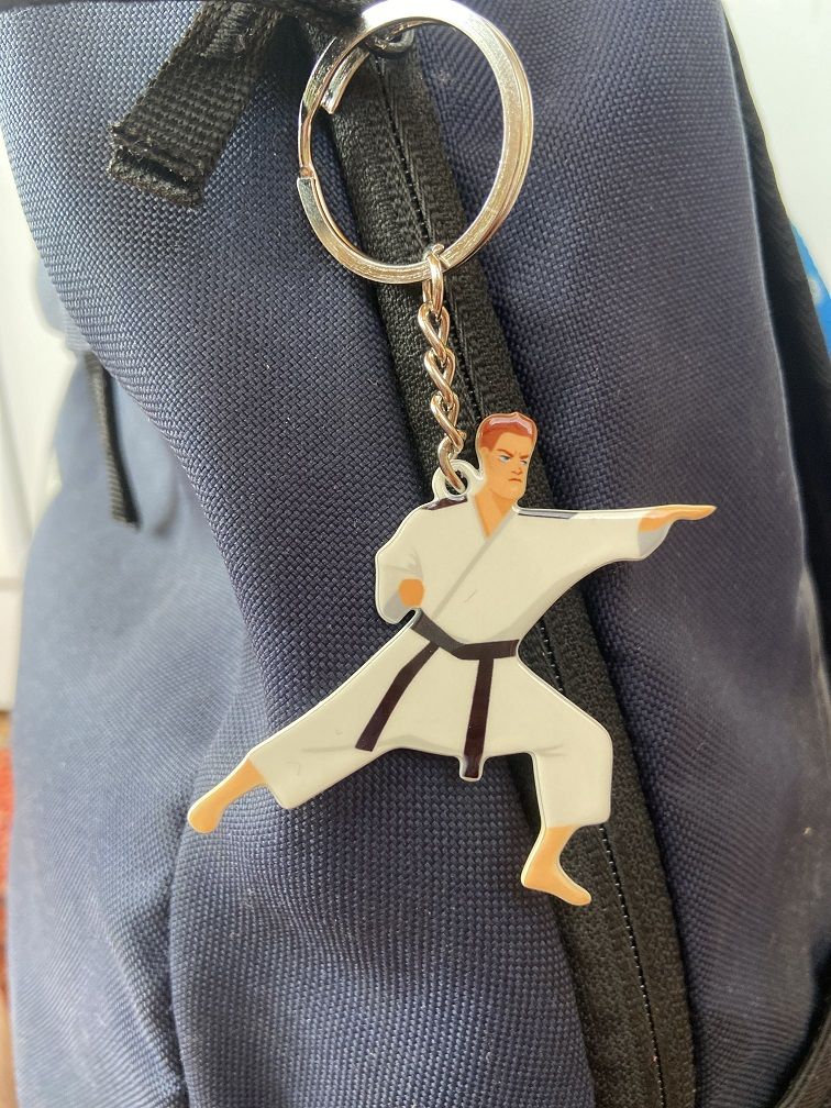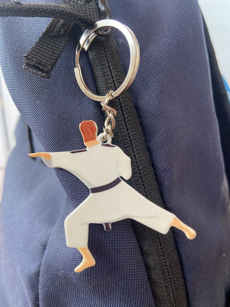 Брелок металлический двусторонний плоский каратист станет прекрасным памятным подарком как взрослому, так и ребенку.
