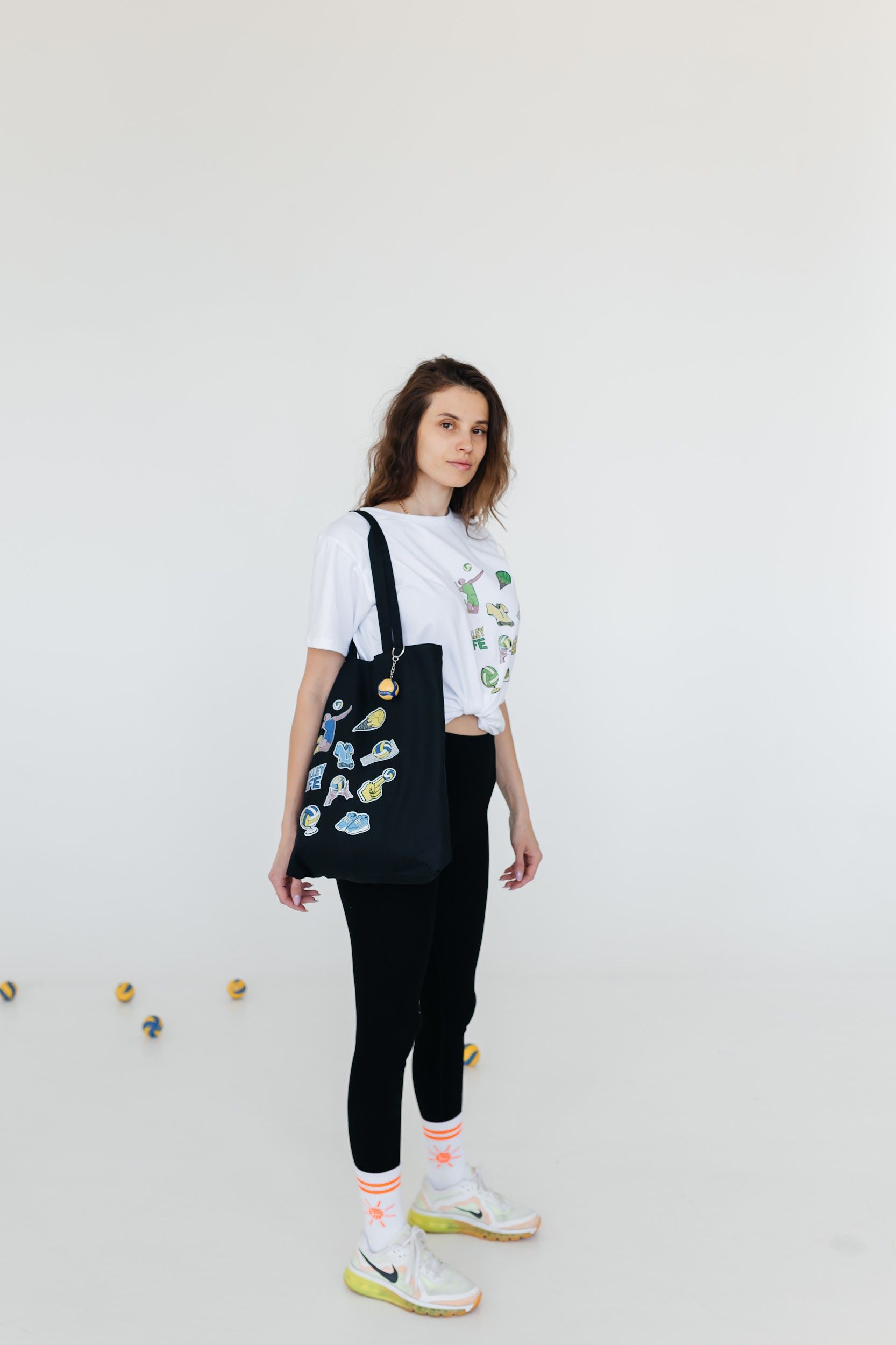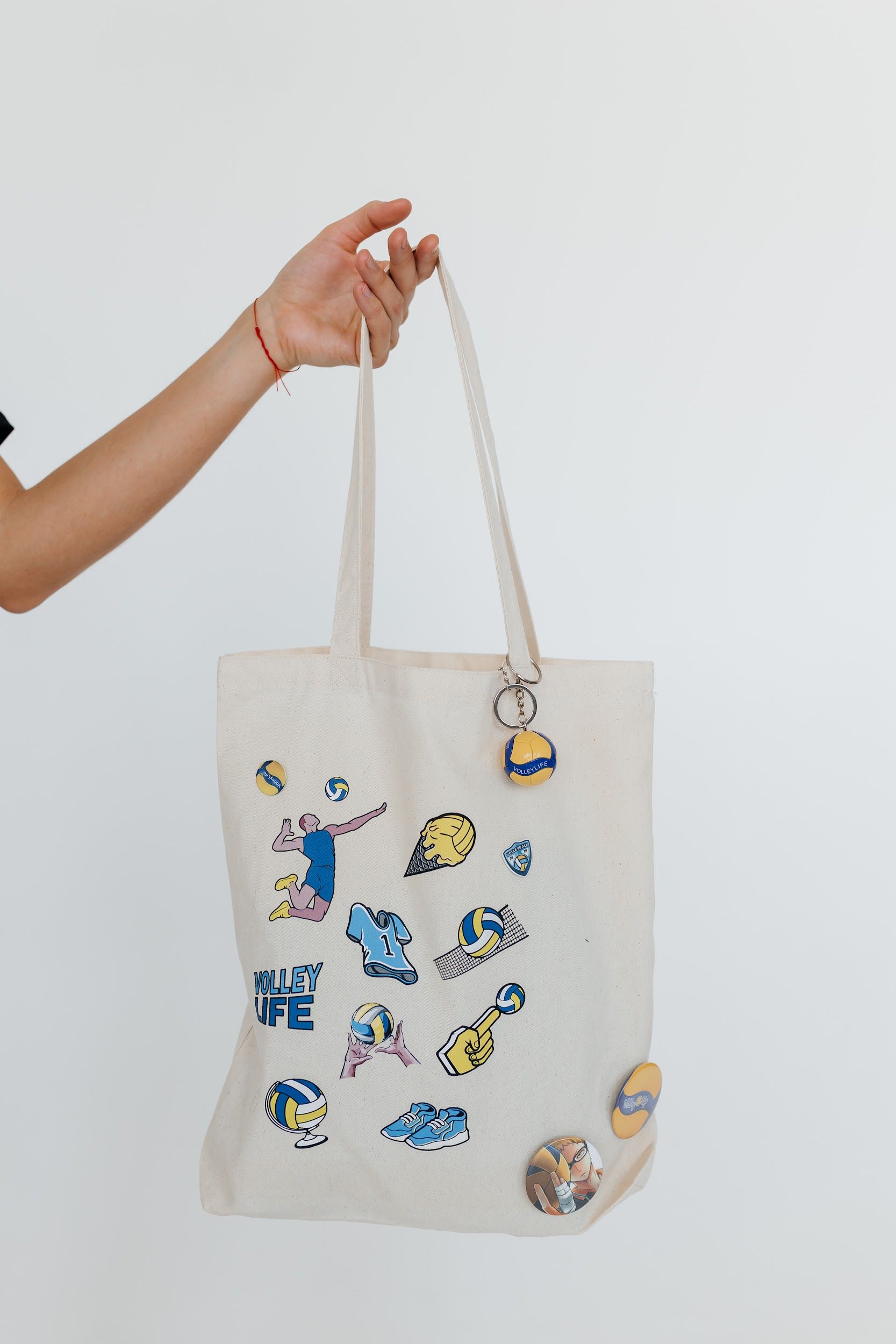 Прочная, легкая и вместительная холщовая сумка с яркими волейбольными стикерами станет незаменимым летним аксессуаром! Можно взять с собой в путешествие, на пляж, в поход по магазинам или просто на прогулку.